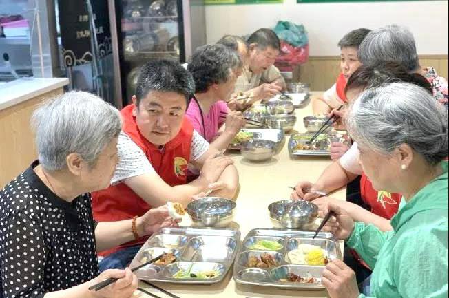 老人们在社区餐厅吃午饭