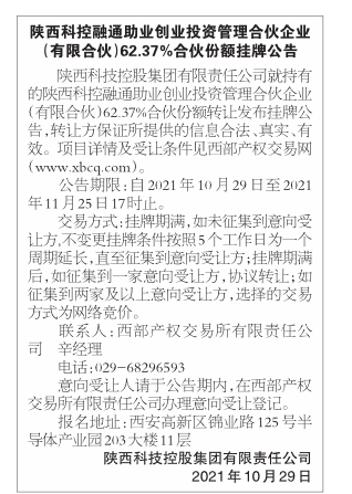 陕西科控融通助业创业投资管理合伙企业(有限合伙)62.37%合伙份额挂牌公告