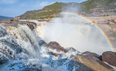 10月18日,黄河壶口景区出现彩虹飞瀑景致。当日,蓝天白云下的黄河壶口瀑布“群龙”戏瀑,彩虹卧波。