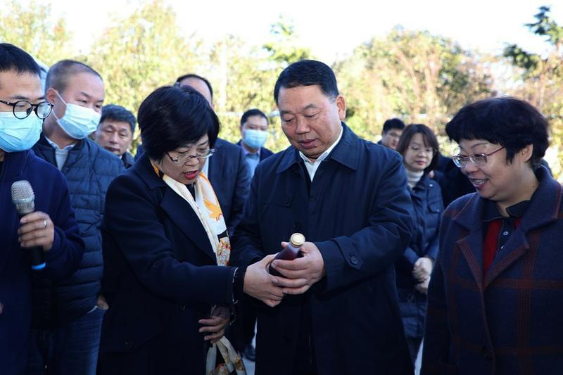 陕西省工业和信息化厅党组书记、厅长张宗科(右二)正在察看宝鸡无时闲酒业有限公司生产的产品。
