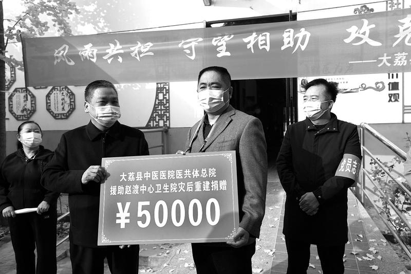 大荔县卫健局按照县委、县政府要求,发挥医共体协同帮扶作用,11月4日,县卫健局和20多名医护人员来到遭受洪水灾害的赵渡卫生院,送去捐款5万元,用于灾后重建,全力以赴确保灾后医疗服务全面恢复。