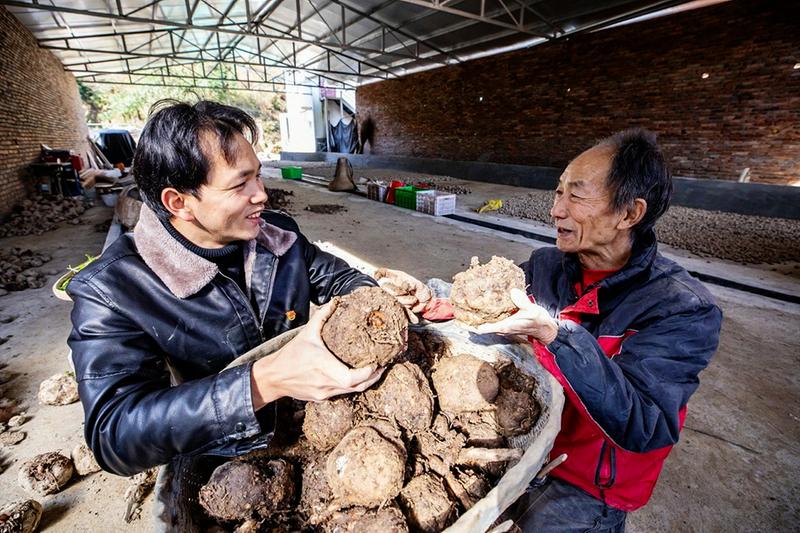 勉县漆树坝镇漂草沟村,第一书记李毅安(左)和村民一起查看刚刚收获的魔芋品质。