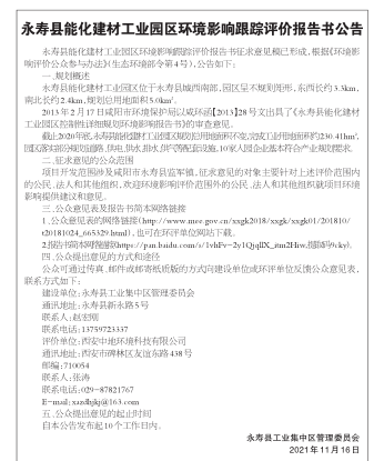 永寿县能化建材工业园区环境影响跟踪评价报告书公告