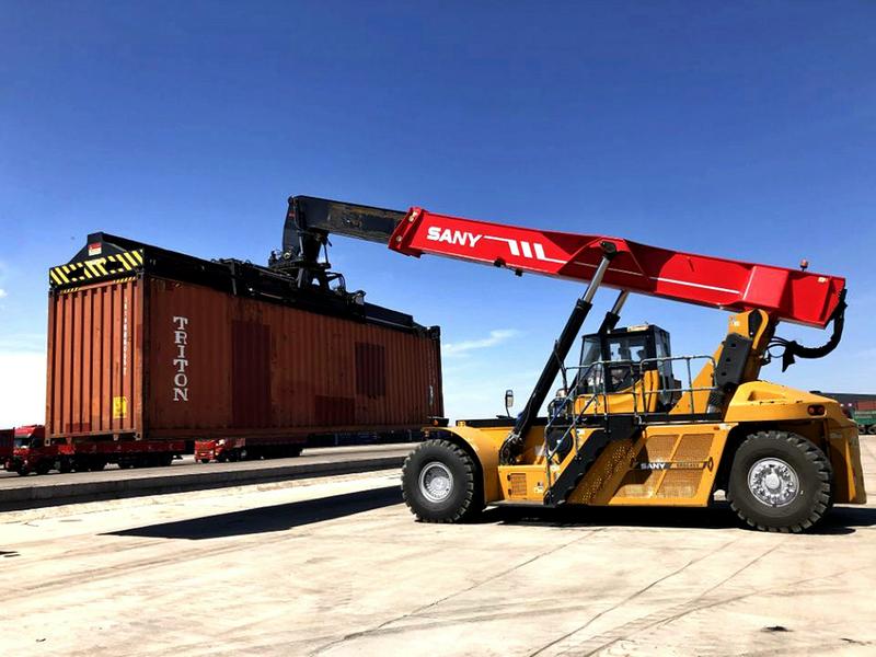 图为吊车在榆林国际陆港(靖边经开区商贸物流园)装运集装箱。