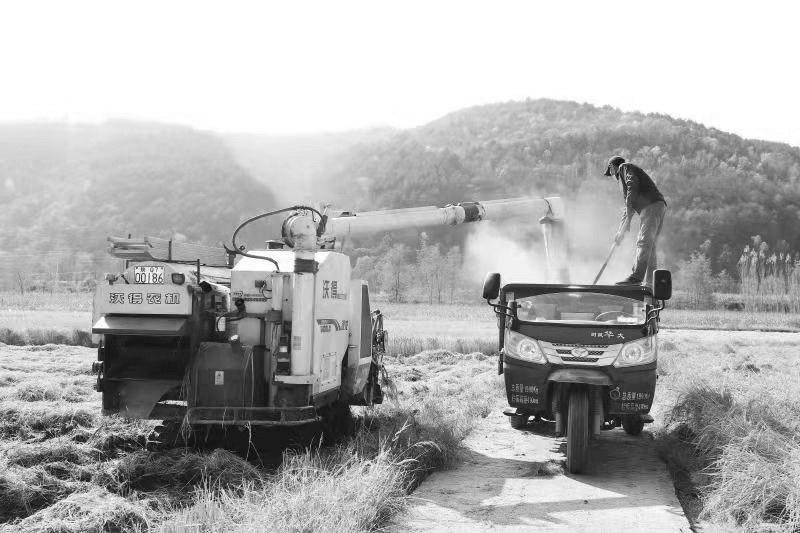 图为在富县张家湾镇川庄村水稻田里,收割机正开足马力,全力收割。