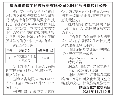 陕西维纳数字科技股份有限公司0.8494%股份转让公告