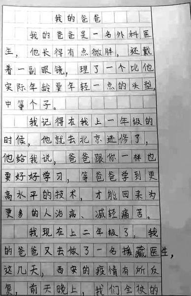 你写的《我的爸爸》信件我已收到,我亲爱的朵朵,请原谅爸爸选择了舍小家顾大家,去执行陕西省第七批援藏任务,去践行医者的誓言,为国家贡献一份力量,展现新时代白衣天使的责任与担当。当爸爸看到你写的作文后,远在3742公里之外的我忍不住潸然泪下。
