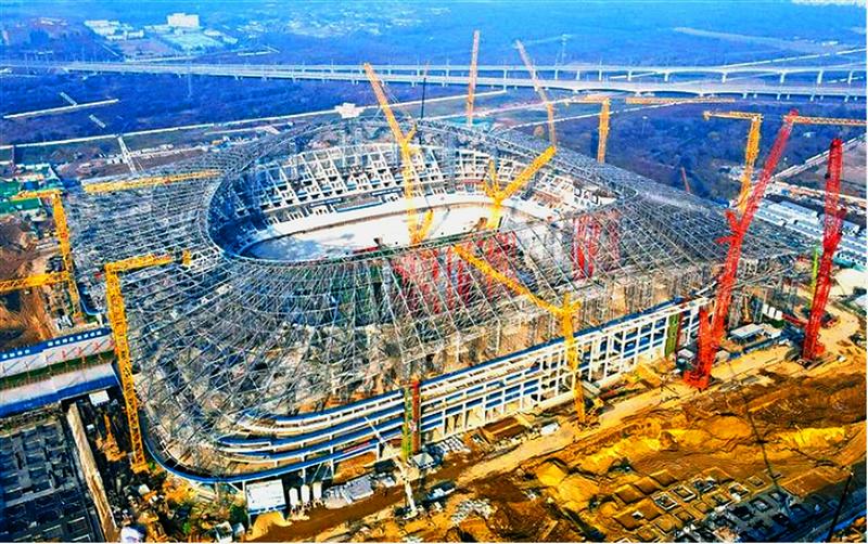 近日,随着最后一块屋盖钢结构块体吊装完成,西安国际足球中心实现了总重7600吨的屋盖钢结构合龙,主体形象呈现。作为2023年中国亚洲杯西安赛区主场馆,西安国际足球中心位于西咸新区沣东新城复兴大道东侧,建筑面积25万平方米,可容纳6万人观赛,预计明年6月全面竣工。