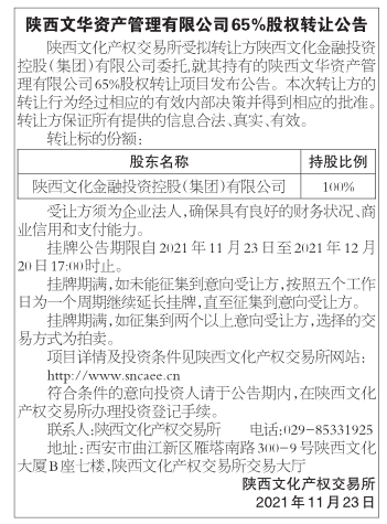 陕西文华资产管理有限公司65%股权转让公告