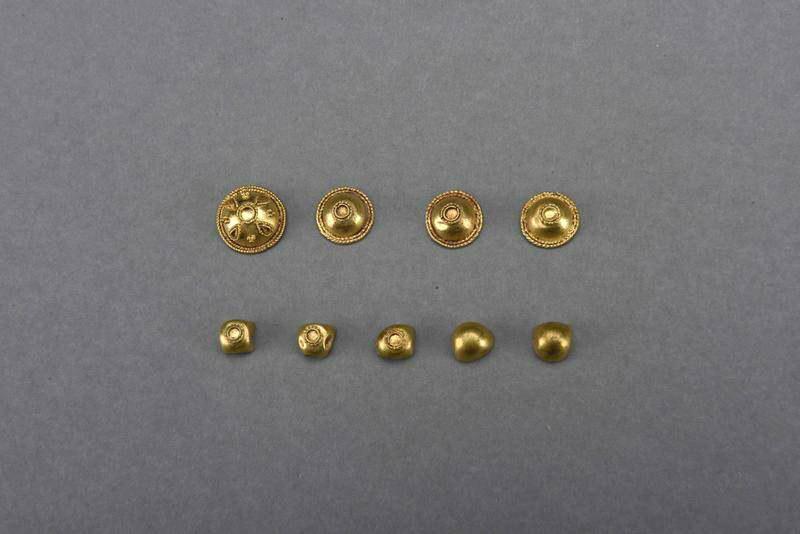 据介绍,编号M5的秦墓内发现的小型金饰出土于墓室内,因墓葬被盗,原初位置已不清楚,但从其大小和背面有扣来分析,应该为衣服上装饰可能性较大。金饰表面有多处焊接的绳索纹和金珠,绳索纹在草原文化金银带扣的边框上经常出现,焊接金珠的工艺最早出现于两河流域和地中海沿岸,战国中晚期开始流行于我国西北游牧民族地区,西汉时焊珠工艺在中原地区出现。因此无论是从用途还是工艺上来看,这一组小型金饰都具有典型的北方草原文化风格。