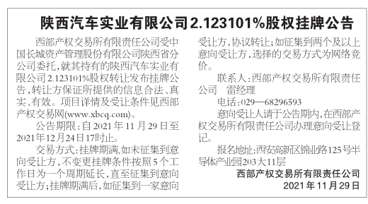 陕西汽车实业有限公司2.123101%股权挂牌公告