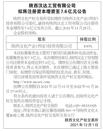 陕西汉达工贸有限公司拟将注册资本增资至7.6亿元公告