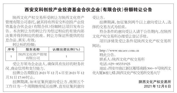 西安交科创投产业投资基金合伙企业(有限合伙)份额转让公告