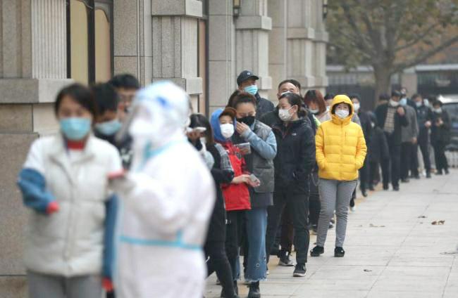 11月17日,大连市玉华社区居民在核酸检测点外排队等候核酸采样。 自11月4日大连报告本轮首例本土新冠肺炎确诊病例后,感染人数5天破百,单轮疫情累计超300例本土病例确诊,让这座海滨城市再次成为疫情防控的焦点。