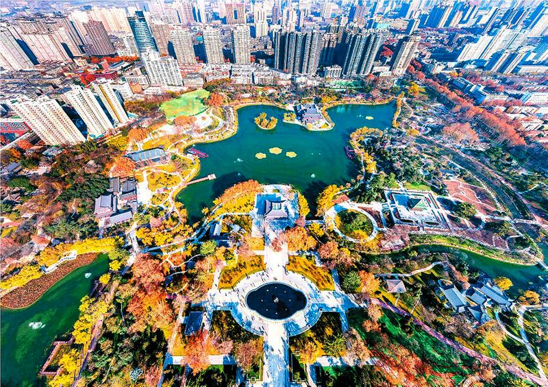 12月6日,无人机视角下的兴庆宫公园。入冬后的兴庆宫公园,色彩斑斓的秋叶围绕在碧色的湖水周围,呈现出一幅别样的城市美景。
