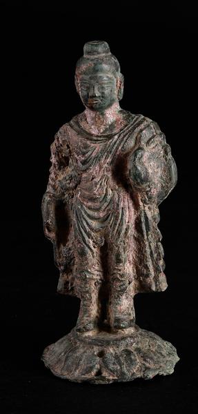 “成任墓地”出土的金铜释迦牟尼立像,为小肉髻,顶部较平,身穿通肩袈裟,衣纹从左肩向右肩呈放射状分布,衣纹波谷在右胸和右臂之间。左手屈肘上举,持袈裟一角;右手上举施无畏印(手部残)。跣足立于覆莲座上。通高10.5厘米、台座底径4.7厘米。