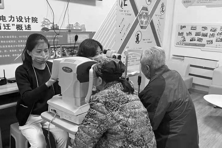 党史学习教育开展以来,西电设社区深入推进“我为群众办实事”实践活动,依托全区大健康产业人才培育基地西安存济医学中心和街道级综合养老服务中心等周边丰富的医疗资源,通过定期服务、定点服务、上门服务、建立健康档案等形式为居民提供了高质量医疗健康服务,把实事办到了群众心坎里。图为医疗人员现场给社区群众做眼部检查。