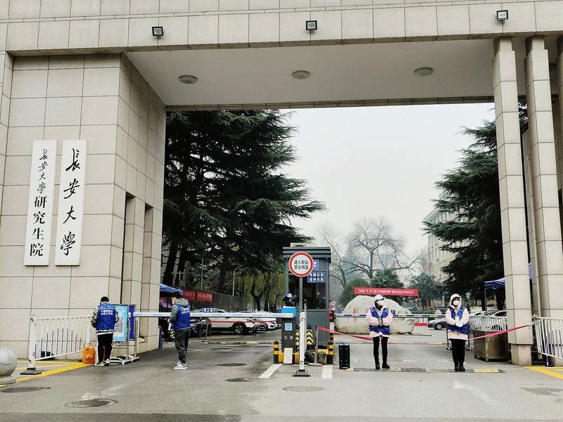 12月15日下午,长安大学研究生院大门外增加了小寨路街道社区工作队协助防疫。