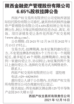 陕西金融资产管理股份有限公司6.65%股权挂牌公告