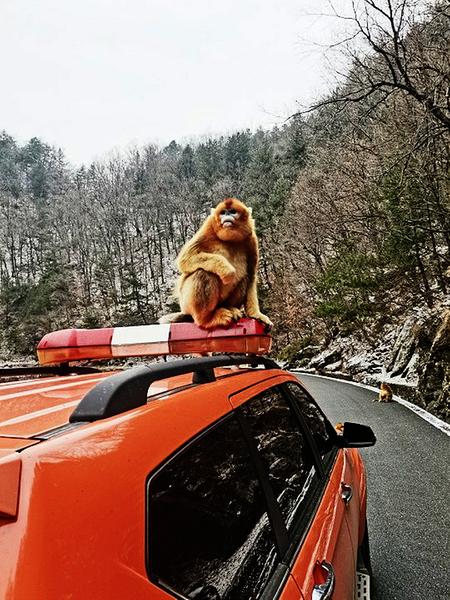 刚开始巡护队员以为金丝猴有伤病求助,停车下去察看详情,并将巡山带的炕炕馍拿了一小段递给金丝猴。不料,金丝猴吃完炕炕馍,马上身形敏捷地跃上车头,跳上车顶的警报器上,发出大声“吱吱”叫声。
