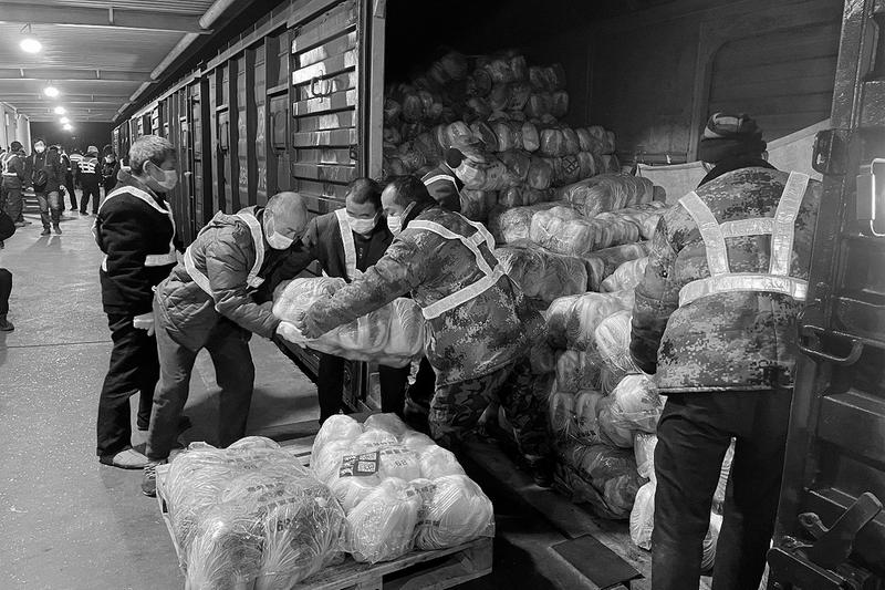 12月29日22点52分,陕西首批铁路运输抗疫生活物资搭乘57999次列车抵达西安国际港站,面粉、米、蔬菜等158.2吨生活物资将从西安国际港站紧急转运,分拨到西安市疫情防控重点区域,保障市民生活需要。