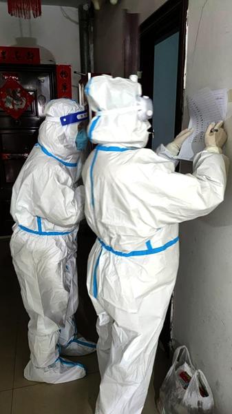 “你好,谢谢你的配合,有需要随时联系我们,电话都有吧?”关怀询问了2004的住户后,记者眼前的面罩已经被雾气凝结的水珠打湿,平行视角已经看不到登记表上的字只好仰头把表拿得高一点。小刘的眼罩前也是一片模糊,没法拉开防护服拿纸巾擦拭,我和小刘互相用防护服简单的蹭了一下,保险起见不能脱掉。