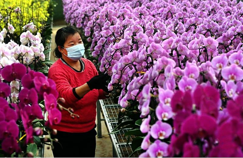 近日,陕西省西安市蓝田县洩湖镇一花卉基地的蝴蝶兰竞相绽放,不少商家前来选购。根据疫情防控实际,西安市各区县根据实际情况支持企业有序复工复产。图为花卉基地的员工在打理蝴蝶兰。