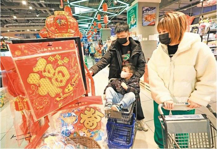 随着西安市疫情防控形势持续向好,不少低风险地区的市民开始为临近的春节准备年货。图为市民在西安曲江新区盒马鲜生采购年货。