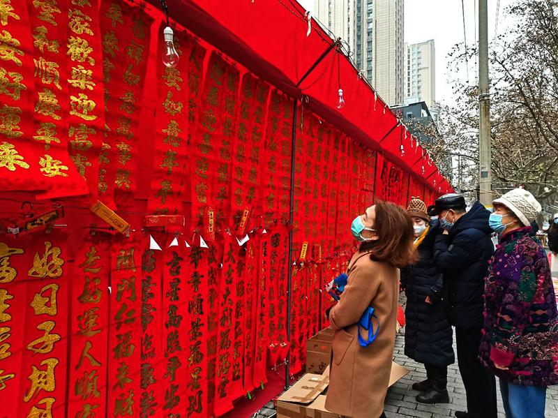1月25日,小年。龙首北路人头攒动,随着疫情的平息,西安百姓的生活秩序逐渐恢复。随着春节的临近,西安街头部分区域挂上了红红的灯笼,一些商铺也挂起了新年的宣传海报。记者来到龙首北路看到,售卖春联、挂饰等年货的临时摊位已经支起,众多的摊点上,摆放着大量红色的春联纸,不少书法爱好者提笔挥毫泼墨,草书隶篆、笔走龙蛇,为众多来此购买春联的市民精心书写春联。