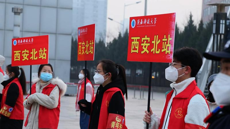 志愿者高举指示牌为返乡学生做引导 临近春节,学生们对家乡的思念随着疫情的好转日益强烈。1月17日上午,按照学校放假安排,经陕西省教育厅和西安市未央区疫情防控指挥部批准,陕西科技大学首批学生踏上了返乡之路。