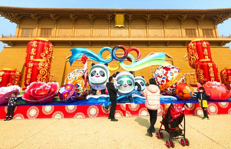 随着北京冬奥会如火如荼地进行,冬奥会吉祥物冰墩墩也因其憨态可掬的形象赢得了观众青睐。2月9日,在西安大明宫国家遗址公园丹凤门前,记者看到,三只冰墩墩造型花灯与中国传统花灯相映生辉,引来众多市民拍照留念。