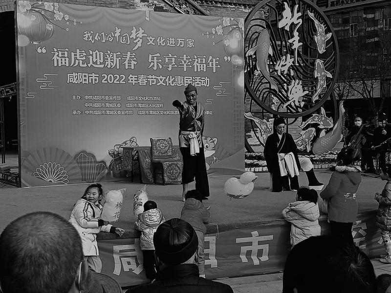 2月13日,一台深受关中群众喜爱的秦腔折子戏等文艺演出在古城咸阳钟楼广场举办。当日,由咸阳市渭城区委宣传部主办的以“福虎迎新春乐享幸福年”为主题的2022年春节文化惠民活动拉开序幕。台上演员精彩有趣的表演及字正腔圆浓郁的西北秦腔韵律,博得了现场观众的阵阵掌声和好评。