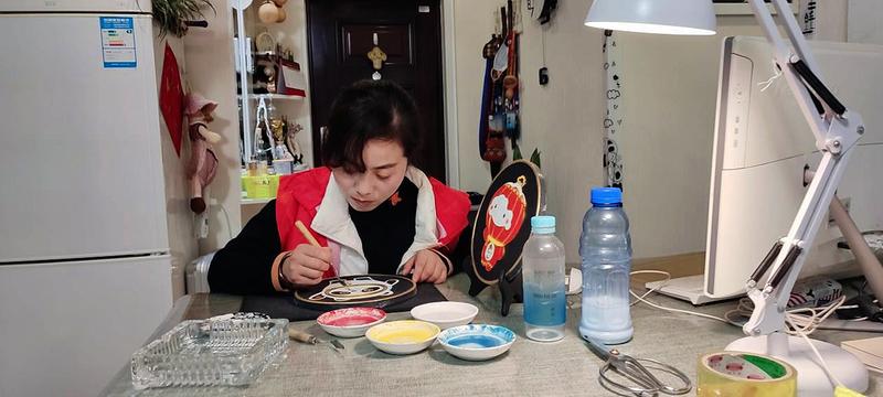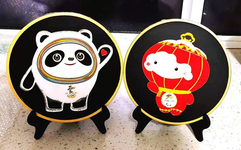 乾县民间工艺志愿者王侠制作金箔丝唐卡活性炭“冰墩墩”“雪容融”。