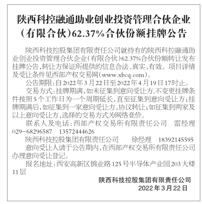 陕西科控融通助业创业投资管理合伙企业(有限合伙)62.37%合伙份额挂牌公告