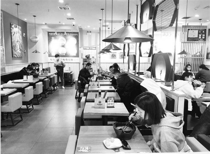 近日西安市有序恢复经营活动,商场内餐厅已逐步恢复堂食。图为在雁塔区一家商场内,市民正在餐饮店内就餐。