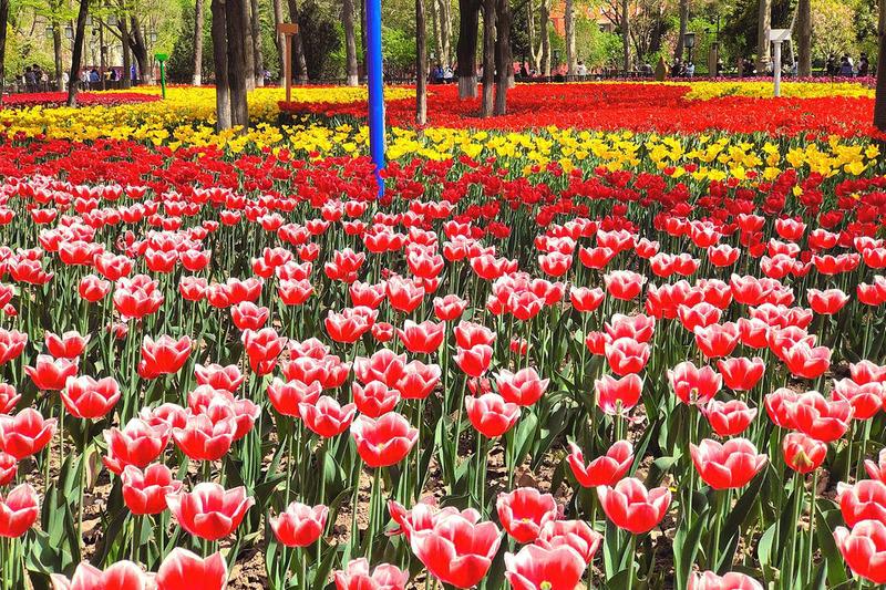 近日,记者来到了西安兴庆宫公园,发现公园里的郁金香已经大面积开放,吸引了很多游客前来观赏。据了解,今年整个园区内共有23个郁金香品种,不少品种花期更迭,游客能观赏更长的时间。