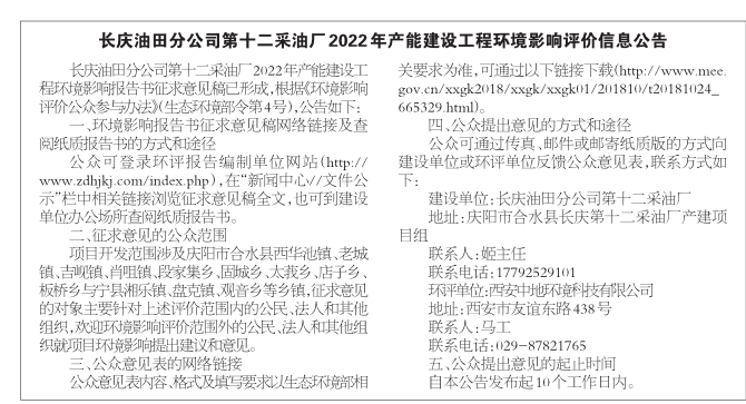 长庆油田分公司第十二采油厂2022年产能建设工程环境影响评价信息公告