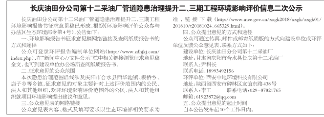 长庆油田分公司第十二采油厂管道隐患治理提升二、三期工程环境影响评价信息二次公示