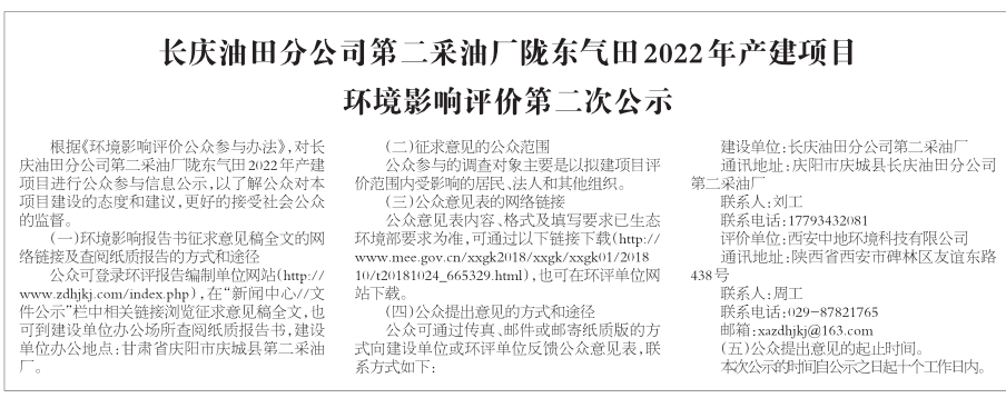 长庆油田分公司第二采油厂陇东气田2022年产建项目环境影响评价第二次公示