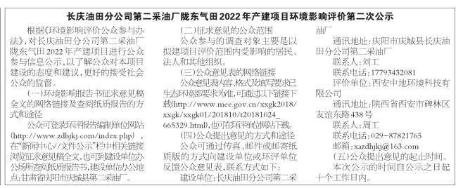 长庆油田分公司第二采油厂陇东气田2022年产建项目环境影响评价第二次公示