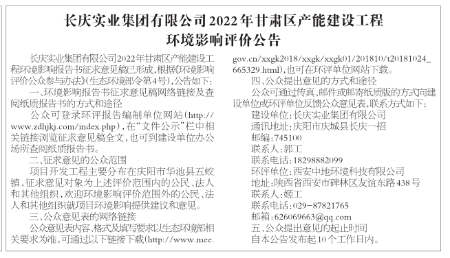 长庆实业集团有限公司2022年甘肃区产能建设工程环境影响评价公告