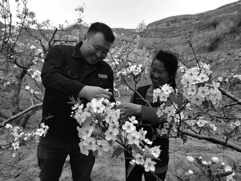 魏擘和村民惠海艳对梨树进行疏花 4月20日,魏擘起了个大早,准备与田家沟村支书李璧开始一天的逐户走访工作,和往常一样,他开上自己的私家车,一脚油门,车子就驶入了蜿蜒曲折的村道。