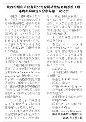 陕西铅硐山矿业有限公司全尾砂胶结充填系统工程环境影响评价公众参与第二次公示