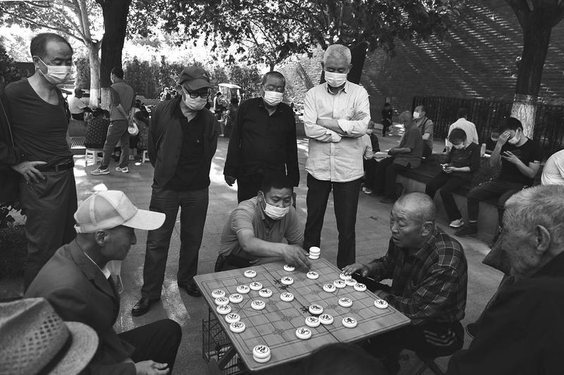 近日,在西安环城公园里,老人们借着公园的长凳、长椅围坐在一起休闲纳凉,下象棋、打扑克,热闹非凡。