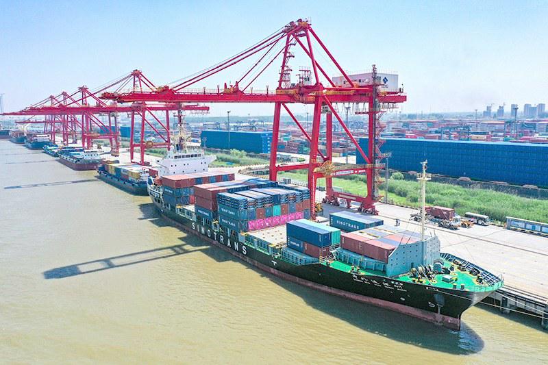 5月6日,集装箱货轮停靠在江苏省港口集团南京港龙潭集装箱有限公司码头(无人机照片)。