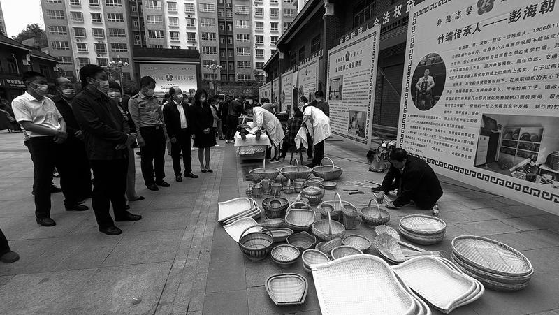 竹编工艺传承人彭海朝是一名下肢残疾人,他从小传承了竹编技艺,在竹林关镇建起了海朝竹编工作室,他现场演示了竹编手法,地上摆满了各类精美的竹编工艺品,提升了传统竹编的附加值,也为他带来了月均3000元以上的固定收入。