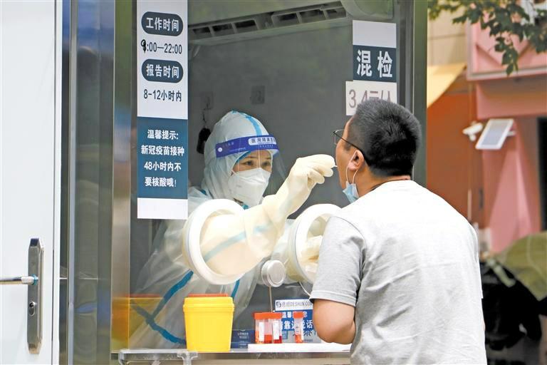在西安市未央区华远君城便民核酸采样点,市民进行采样。 国内疫情形势如何?高校学生离校返乡有何防疫要求?6月5日,国务院联防联控机制召开新闻发布会,就全国疫情、高校学生离校返乡、学生购票等热点问题作出回应。
