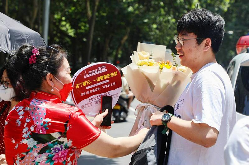 ▲在西安市第八十二中考点,首场语文考试结束,家长为孩子送上鲜花。