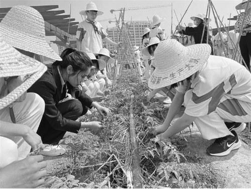 近日,教育部印发了《义务教育课程方案》,落实“双减”要求,将劳动从综合活动课程中完全独立出来,并发布《义务教育劳动课程标准》(2022年版),要求劳动课程平均每周不少于1课时。新规旨在促进学生德智体美劳全面发展,引导学生养成热爱劳动的习惯。图为在西安高新区第十一初级中学教学楼楼顶的“致敬南泥湾”红色教育劳动实践基地凌云农场,七年级同学正在责任田中忙碌。