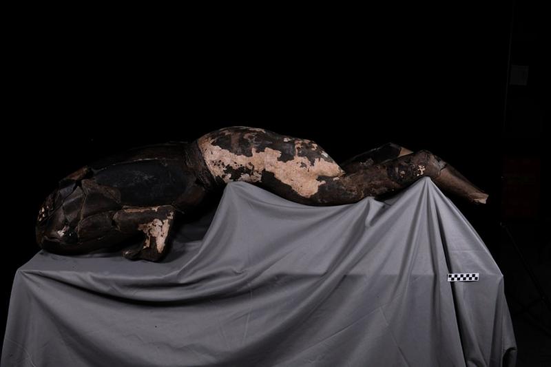 经过反复设计和调整,修复人员为“28号俑”特别定制了展示支架,从而更好地展现其独特姿态。另外,修复人员在“28号俑”的保护修复中还发现了一些独特的制作印记,包括:腹部表面彩绘之上有一处三连指手指纹的痕迹;双臂发现有明显的夹纻痕迹;以及在膝盖处有二次覆泥痕迹。这些都为后期研究制作工艺提供重要方向和线索。